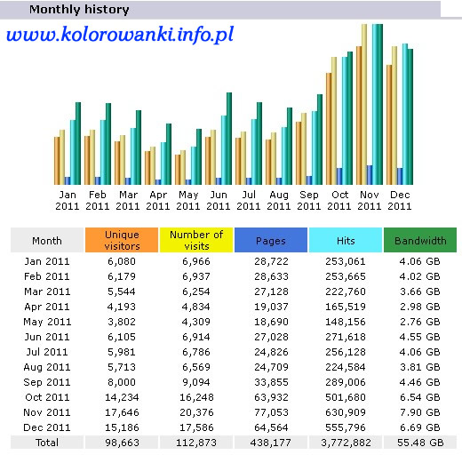 Poniżej zrzuty ekranu statystyk odwiedzin serwisu kolorowanki.info.pl - statystyki Stat4U i Awstats zainstalowane na serwerze: